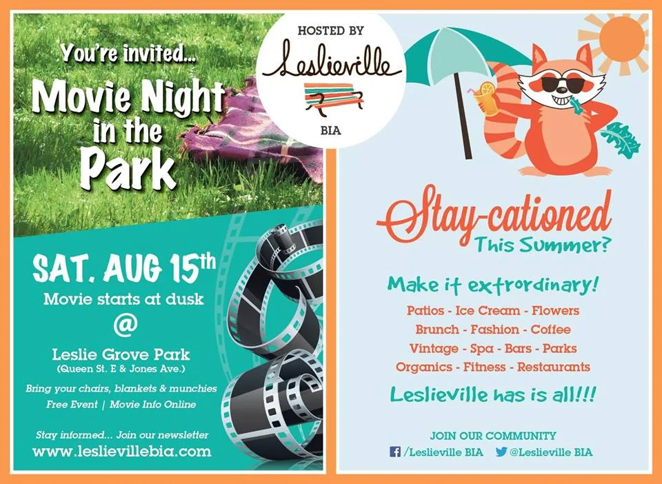 Bring your chairs, blankets and munchies out to Leslie Grove Park for a movie night under the stars with your Leslieville neighbours.