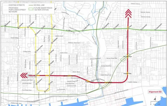 The entire route will run underground in both directions, with several stops along the way. Eight stations have been proposed, including transfer points at Pape Station on Line 2, and Osgoode and Queen Stations on Line 1. There would also be new stations at Queen and Sherbourne, King and Sumach, Queen and Pape, and connections to future SmartTrack stations at Eastern and Broadview and Gerrard and Pape.