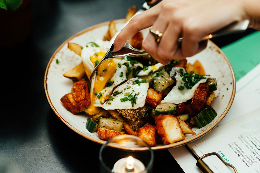 Corrigan has curated a menu that puts a unique spin on classic dishes. Take the souk fries ($12), for instance, which are dressed with fresh and grilled vegetables, fried halloumi and a fried egg.